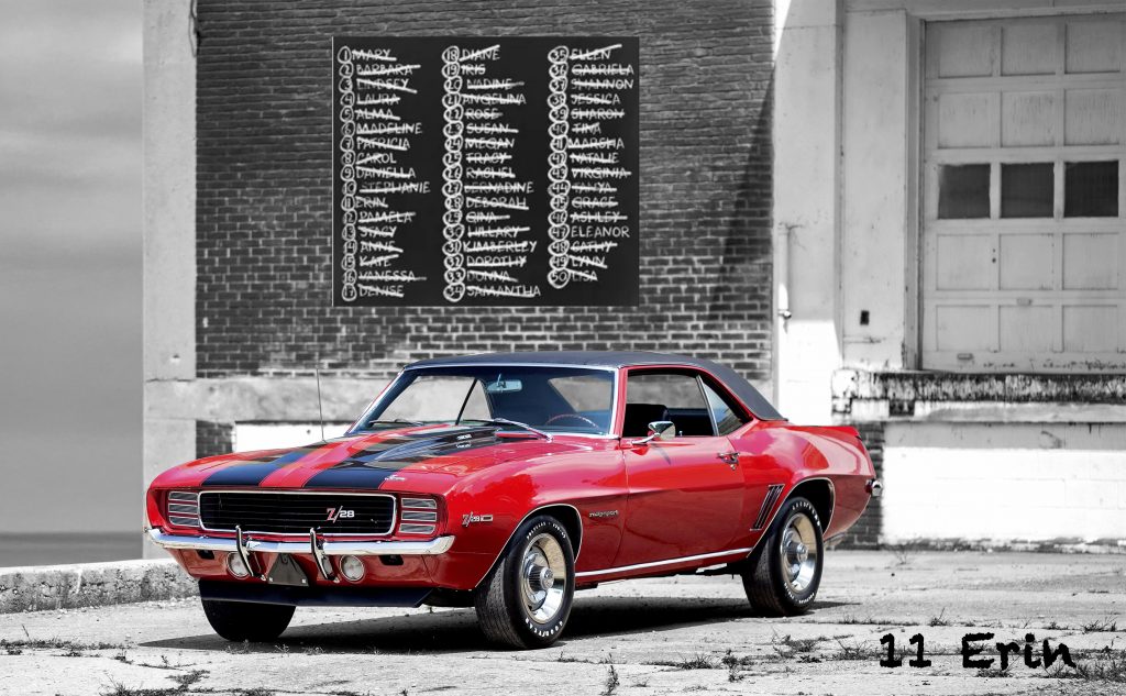 Every person’s name has a corresponding name day. As a car and movie fan, I have taken the 2000 movie Gone in 60 seconds, starring Nicolas Cage an inspiration. In the movie fifty cars are stolen in one night. The fifty cars are listed and given girls names. I have created selective coloration images of these 50 cars. On the name day of the car’s given name, I will post the image. Today it is Erin’s name day, and we celebrate it with an image of the 11th car on the list a 1969 Chevrolet Camaro Z28, the crew called Erin…