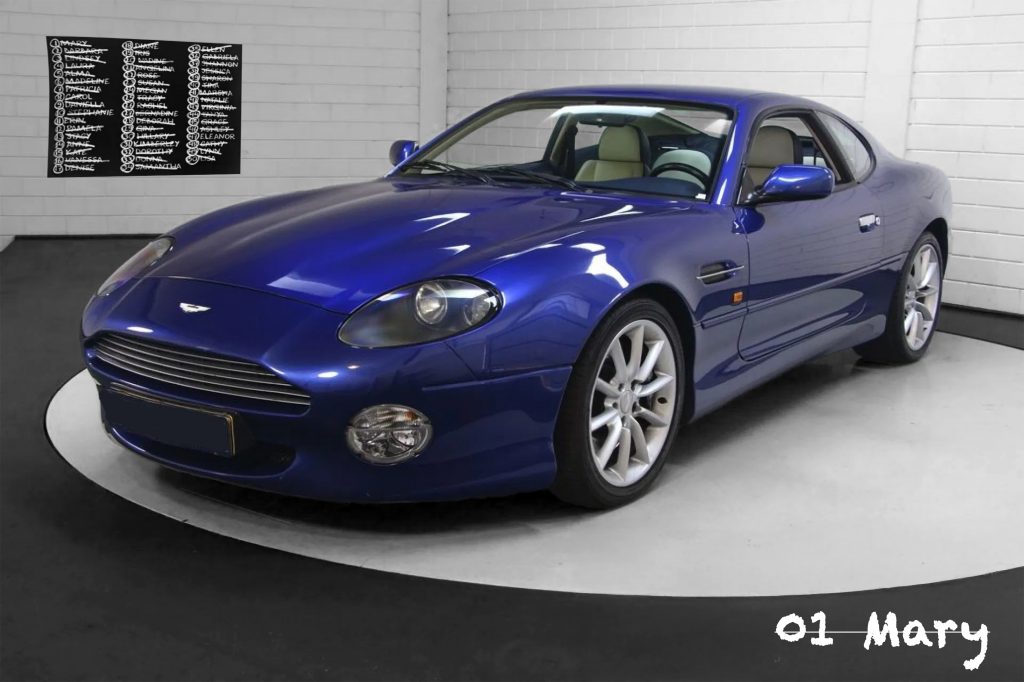 Every person’s name has a corresponding name day. As a car and movie fan, I have taken the 2000 movie Gone in 60 seconds, starring Nicolas Cage an inspiration. In the movie fifty cars are stolen in one night. The fifty cars are listed and given girls names. I have created selective coloration images of these 50 cars. On the name day of the car’s given name, I will post the image. Today it is Mary’s name day, and we celebrate it with an image of the 1st car on the list a 1999 Aston Martin DB7, the crew called Mary…