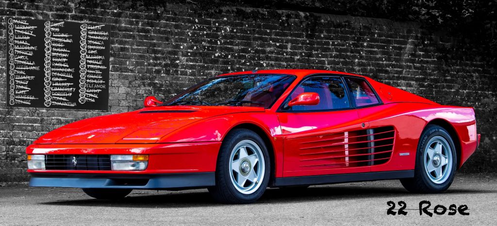 Every person’s name has a corresponding name day. As a car and movie fan, I have taken the 2000 movie Gone in 60 seconds, starring Nicolas Cage an inspiration. In the movie fifty cars are stolen in one night. The fifty cars are listed and given girls names. I have created selective coloration images of these 50 cars. On the name day of the car’s given name, I will post the image. Today it is Rose’s name day, and we celebrate it with an image of the 22nd car on the list a 1987 Ferrari Testarossa, the crew called Rose…