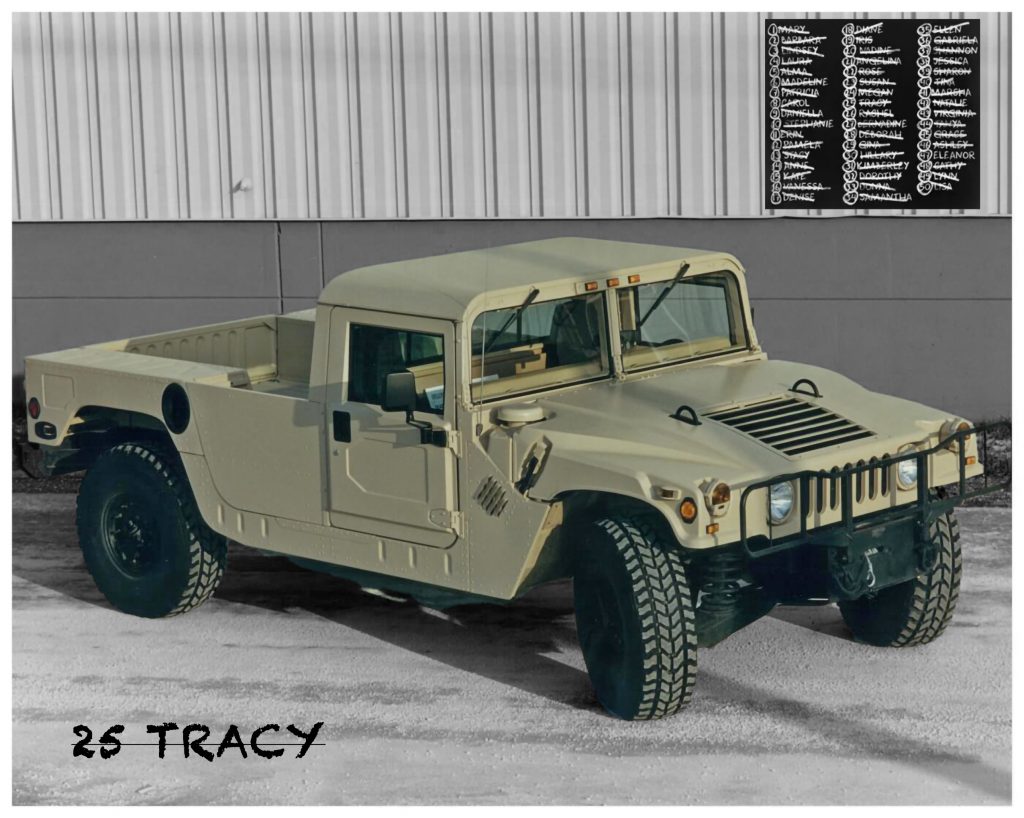 Every person’s name has a corresponding name day. As a car and movie fan, I have taken the 2000 movie Gone in 60 seconds, starring Nicolas Cage an inspiration. In the movie fifty cars are stolen in one night. The fifty cars are listed and given girls names. I have created selective coloration images of these 50 cars. On the name day of the car’s given name, I will post the image. Today it is Tracy’s name day, and we celebrate it with an image of the 18th car on the list a 1999 Hummer H1 Two-Door Pickup, the crew called Tracy…