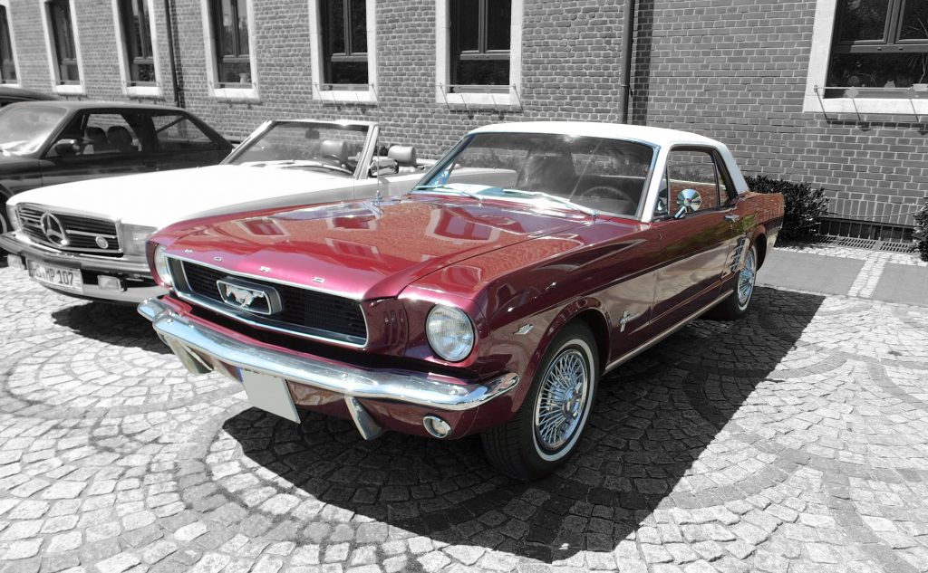The first-generation Ford Mustang was manufactured by Ford from March 1964 until 1973. The introduction of the Mustang created a new class of automobiles known as pony cars. The Mustang’s styling, with its long hood and short deck, proved wildly popular and inspired a host of competition. It was introduced on April 17, 1964, as a hardtop and convertible, with the fastback version following in August 1964. Upon introduction, the Mustang, sharing its platform with the Falcon, was slotted into the compact car segment. The first-generation Mustangs grew in overall dimensions and engine power with each revision. The 1971 model featured a drastic redesign. After an initial surge, sales steadily declined, and Ford began working on a new generation Mustang. With the onset of the 1973 oil crisis, Ford was prepared, having already designed the smaller Mustang II for the 1974 model year. This new car shared no components with preceding models. We celebrate this launch with a red Ford Mustang …